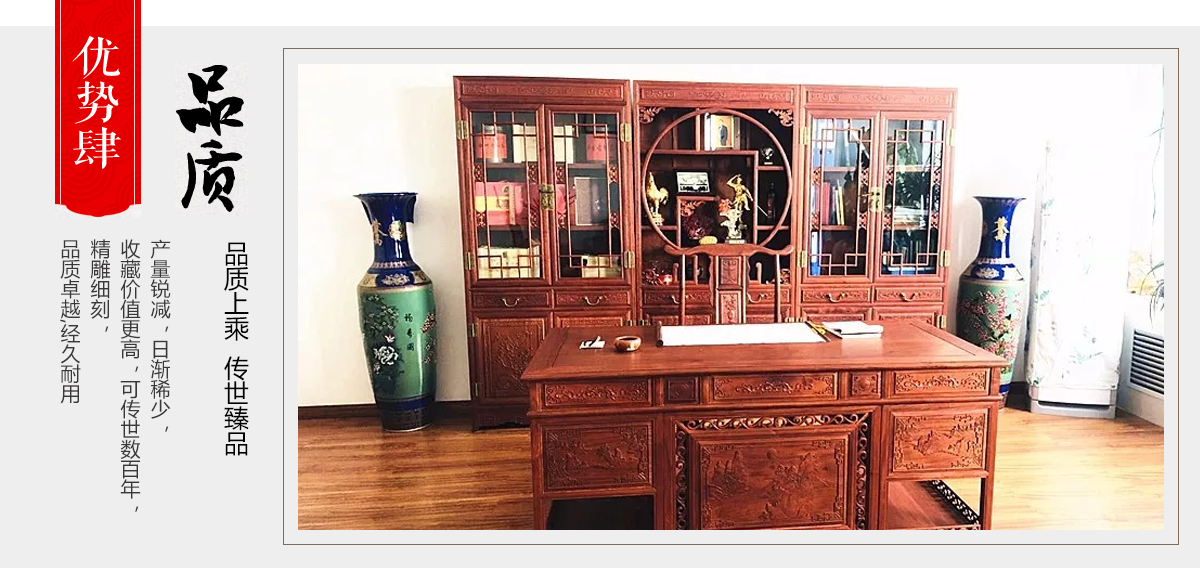 東陽市大聯(lián)福林堂紅木家具廠座落于素有“東方好萊塢”之稱的國家AAAAA級影視旅游基地橫店影視城, 是一家集開發(fā)、設(shè)計、生產(chǎn)、銷售、服務(wù)為一體的綜合型企業(yè)。本公司匯集一批具有豐富生產(chǎn)經(jīng)驗的能工巧匠,具有豐富的紅木家具設(shè)計生產(chǎn)經(jīng)驗。本公司產(chǎn)品主要選用紫檀、花梨、酸枝、雞翅等優(yōu)質(zhì)紅木,并采用純天然蜂蠟飾面。經(jīng)過蒸煮、脫脂、烘干、定型等多道工序嚴(yán)格處理,福林堂紅木始終嚴(yán)格秉承“質(zhì)量第一”、“信譽(yù)至上”的經(jīng)營理念,在繼承傳統(tǒng)工藝的基礎(chǔ)上,不斷創(chuàng)新,大力引進(jìn)先進(jìn)家具設(shè)備、烘干設(shè)備,實現(xiàn)了現(xiàn)代生產(chǎn)工藝與傳統(tǒng)表現(xiàn)手法的有機(jī)相融。